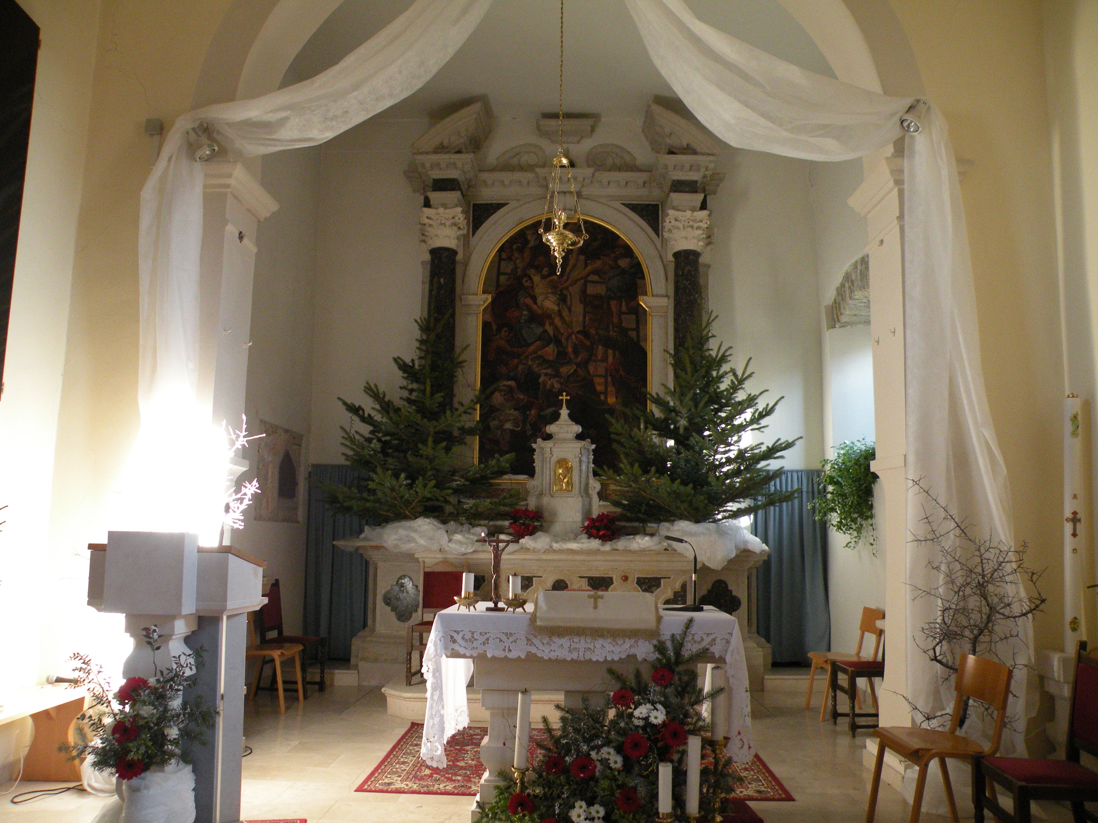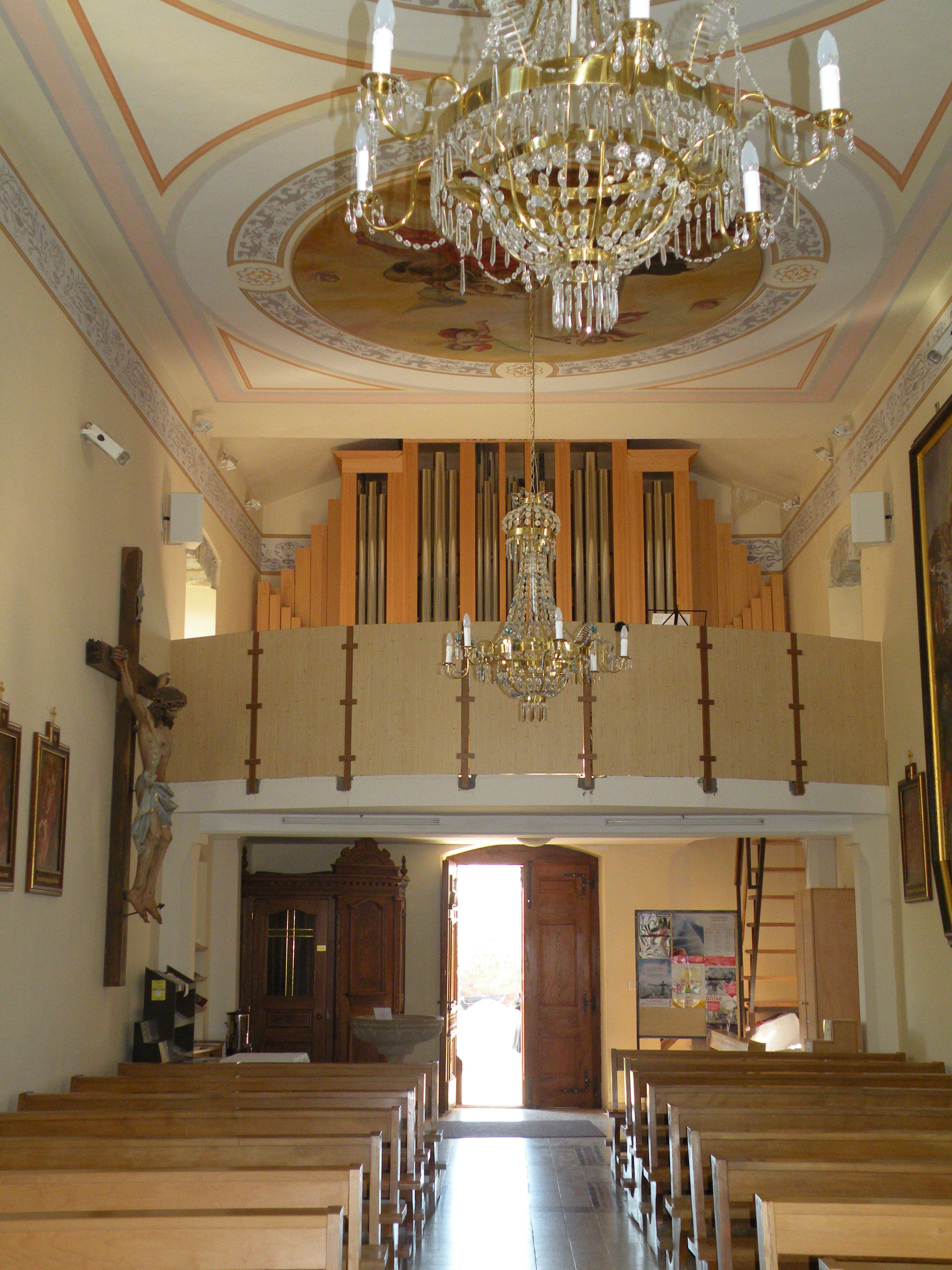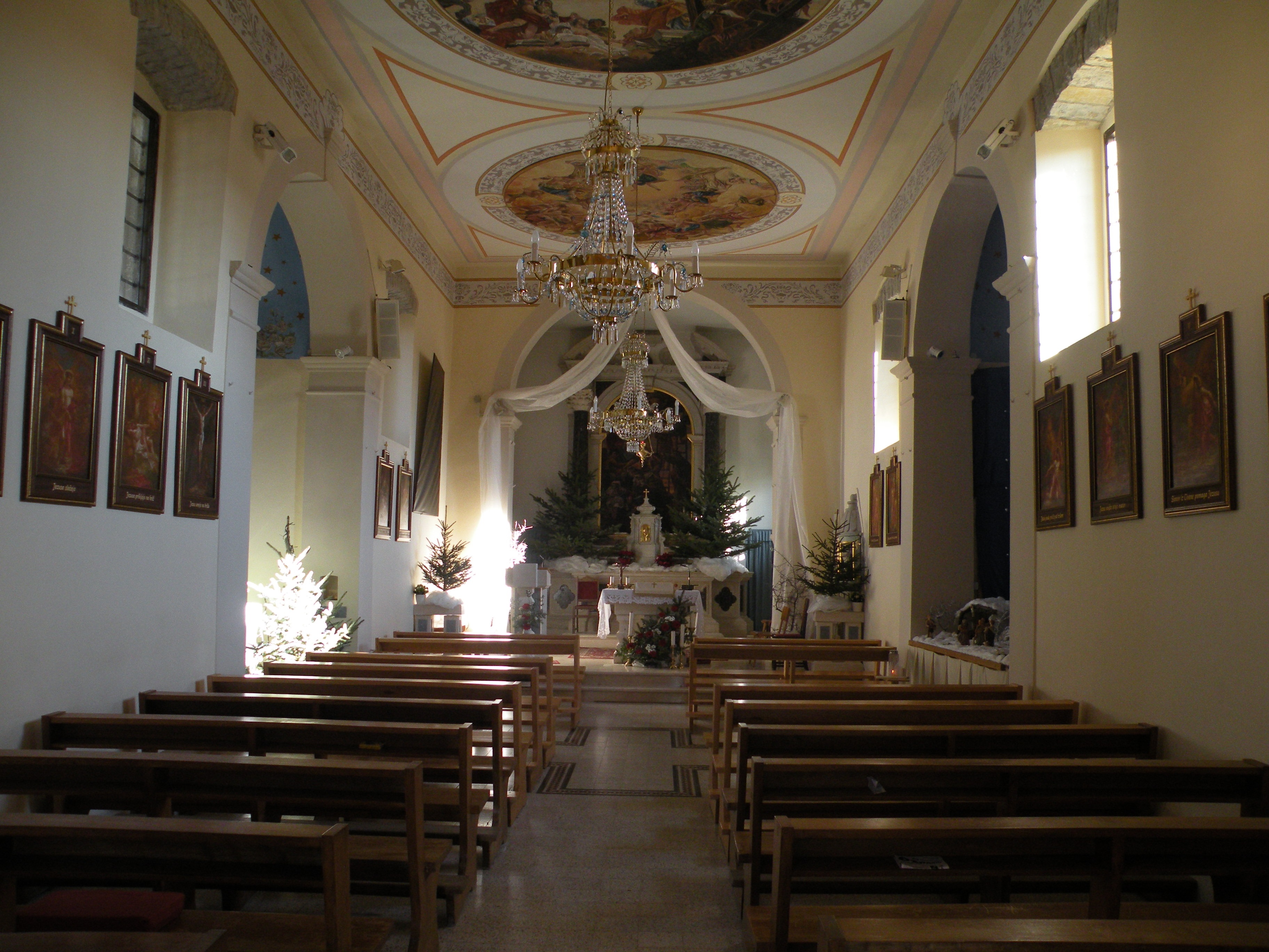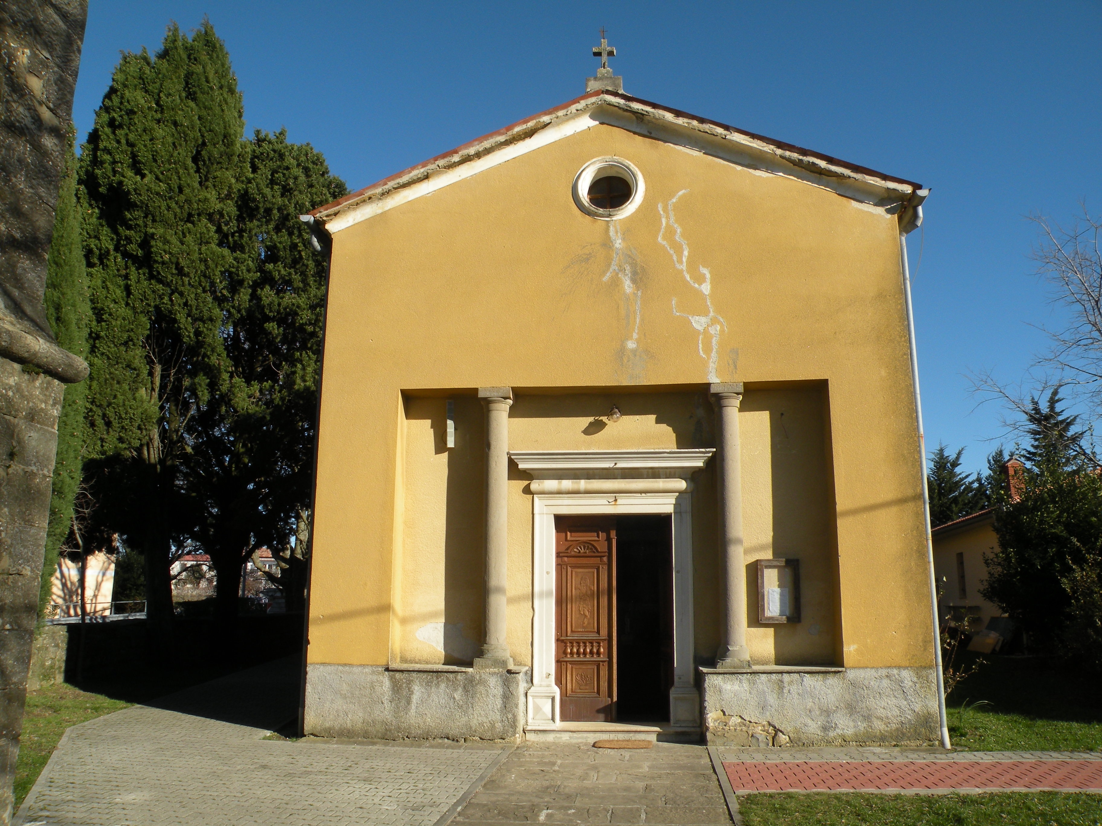 Koprski škof Paolo Naldini v svojem »Cer-kvenem krajepisu« iz leta 1700 omenja, da je cerkev krasilo pet oltarjev; oboki kapele z glavnim oltarjem, kamor je bila postavljena podoba Križanega, so bili iz živega kamna, kapela pa je istočasno služila kot prezbiterij. Šesti oltar, posvečen »Imenu Božjemu«, je škof Hieronim Rusca leta 1624 posvetil bratovščini podeželskih župnikov z vzajemno obveznostjo, da so vsakemu članu ob smrti darovali primerno število maš. Razcvet te nabožne bratovščine je trajal nekaj let, potem pa se je razšla, vendar se je po ponovni obuditvi leta 1698 omejila le na župnike iz kubejske dekanije in je vključevala le javne kurate, ne pa tudi drugih duhovnikov, škof sam pa ji je določil upravitelja in voditelja. Bratovščina je skrbela tudi za oltar sv. Križa, zavetnika župnije; vanjo se je lahko vpisal vsak hišni poglavar in tako postal njen sobrat. Notranjščino, ki jo je leta 1932 v celoti poslikal koprski slikar Ermengildo de Troy, krasita kamnita kustodija, ki izvira iz obdobja baročne predelave notranjščine in lesena prižnica. Cerkveni zvonik (23,28 m), ki je ločen od cerkve, je zrasel leta 1870, ko so cerkev tudi razširili in ji dozidali kor.