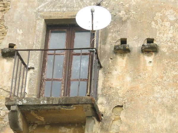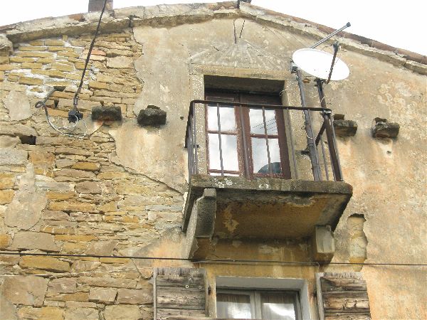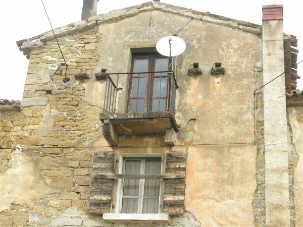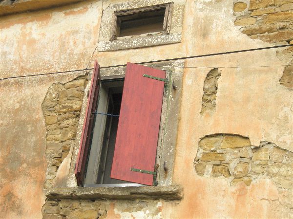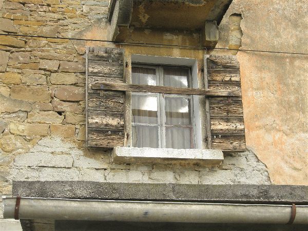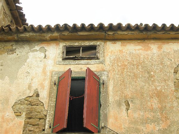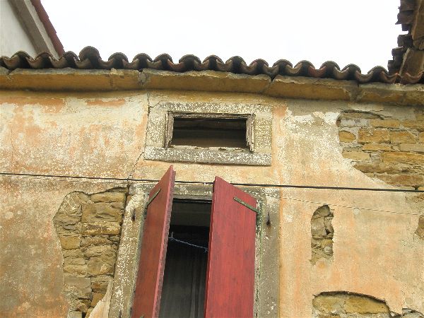 Pod njim je okno s preprostimi lesenimi škurami (polkni). Nekje v višini balkonskih vrat pa so zanimive štiri odprtine – golobnjaki. Povsem v zatrepu trikotnega čela so še rahlo vidni ostanki sončne ure (ali pa gre za okras nad oknom).
