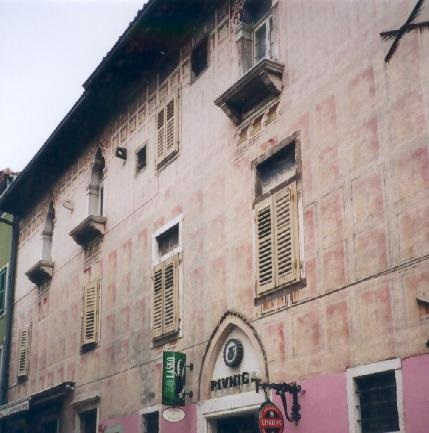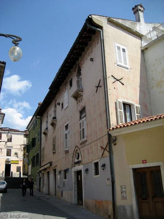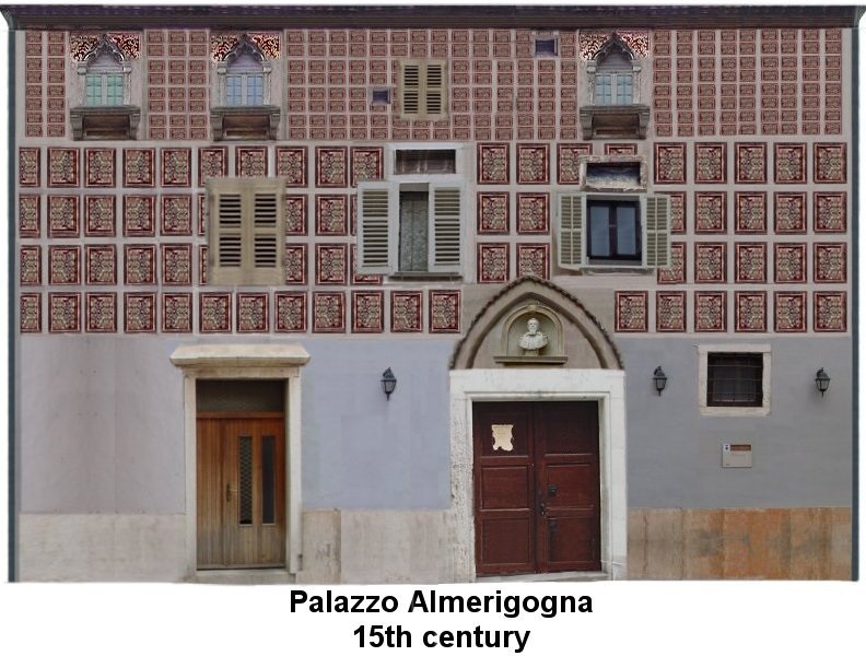 Hiša Almerigogni pa sploh zasluži, da si jo nadrobneje ogledamo. Že na prvi pogled je očitno, da je njena enotna poslikava nastala šele po združitvi dveh enonadstropnih beneško-gotskih hiš, ki se še danes ločita predvsem po globini lindastega napušča in po razporeditvi okenskih odprtin. Vendar je tudi tu opaznih dosti predelav in velika stavba lahko danes dokazuje svoj izvir le s prvotnimi okni v drugem nadstropju in gotskim portalom na desni strani pritličja. Poslopje učinkuje s svojimi bogato razčlenjenimi trolistnimi monoforami s storžastimi nastavki in s svežo poslikavo izredno pisano. Danes pogrešamo še bivšo enonadstropno sosedo s čipkasto razgibanim gotskim frizom; ohranjena nam je le še v risbi Caprinovega ilustratorja De Franceschija.