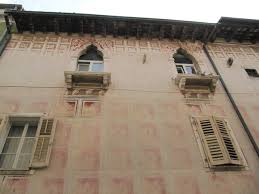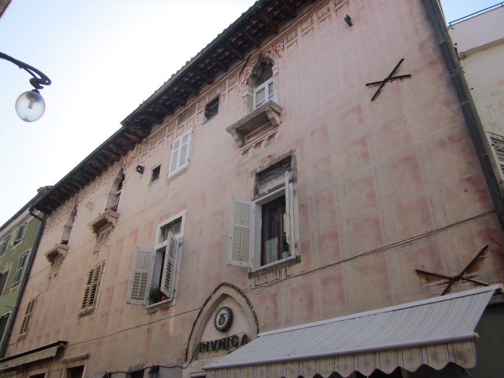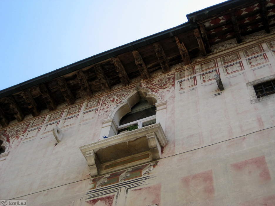 Današnja poslikava pročelja je tista, ki jo je hiša pridobila v času renesanse, seveda večkrat obnovljena. Po renesančni modi so palačo takrat poslikali z lažno novo arhitekturo in pri tem uporabili žive barve, značilne za Benetke v času gotike. Slogovno se na fasadi prepletata gotika in renesansa. Ornamentalna poslikava, ki je že bila restavrirana pred 1. svet. vojno, kaže geometrično motiviko kvadratov in pravokotnikov, v katerih so stilizirane rozete. Okna obkroža stiliziran rastlinski vzorec. Poslikava je bila skoraj v celoti uničena, vendar nam je po natančni preiskavi fasade uspelo leta 1969 rekonstruirati motiviko in barvno skalo. Poslikava je izdelana na sveži omet.