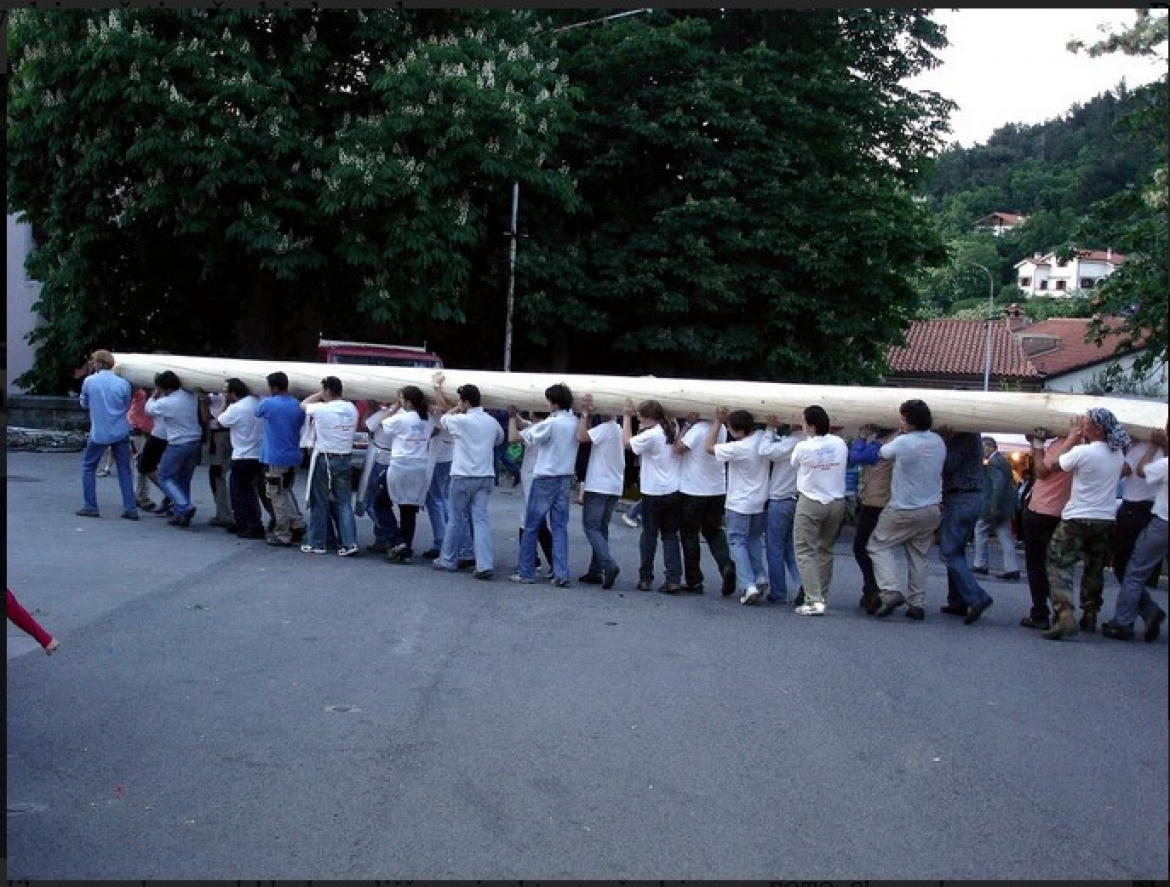 Maj so desetletje dvigovali z vinčem, škripcem, tri desetletja pa z velikim žerjavom. Leta 2000* pa je hrupni žerjav nadomestila neslišna vitla, tako da se maj vzpenja v svečani tišini, s katero več sto glava množica spremlja najdelikatnejše opravilo celotnega obreda.