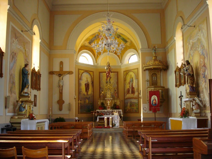 Visoko notranjo ladjo zaključuje raven strop, ki leži pravokotno na neobdelanih stenah; v poligonalno zaključenem prezbiteriju s križastim obokom so podobe iz življenja svetnikov sv. Justa in sv. Evfemije, naslikane leta 1943. Kipi na oltarjih verjetno izhajajo iz rezbarske delavnice iz Ortiseja v Val Gardeni ter jih umeščamo v prvo polovico 20. stoletja. Kor je dekoriran s podobami angelov v mozaični tehniki in sloni na dveh stebrih, na leseni prižnici pa so predstavljeni liki evangelistov. Razmerje višine proti širini je cca. 1,8 : 1, tako da je cerkev relativno visoka. Samostojno stoječi zvonik