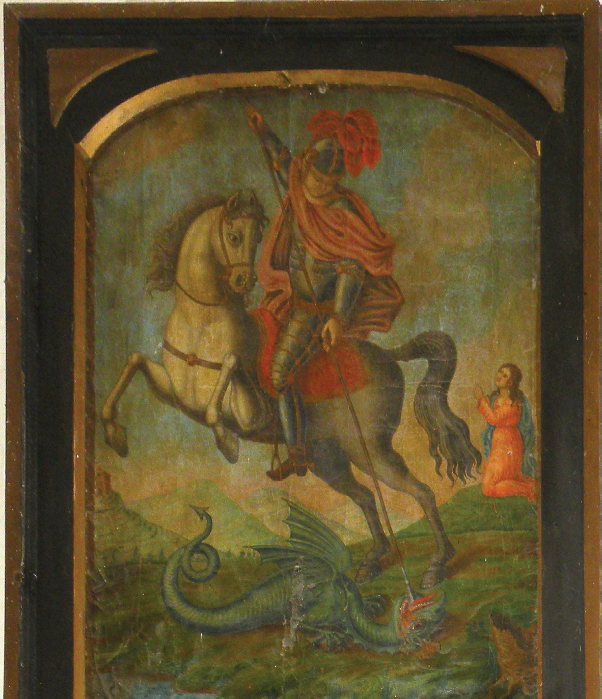 | Napisna plošča na zvoniku | Kipec Marije z detetom | Upodobitev sv. Jurija |